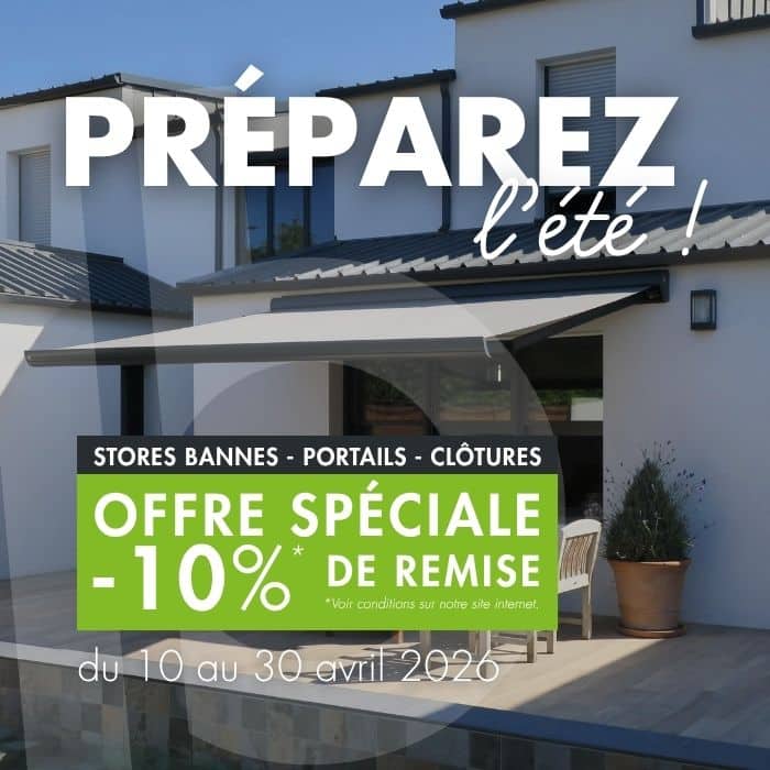*Du 10 au 30 avril 2026, bénéficiez d’une remise de 10 % pour l’achat de stores bannes (fournisseur Batistore), portails et clôtures (fournisseurs Jerrel et Men85).